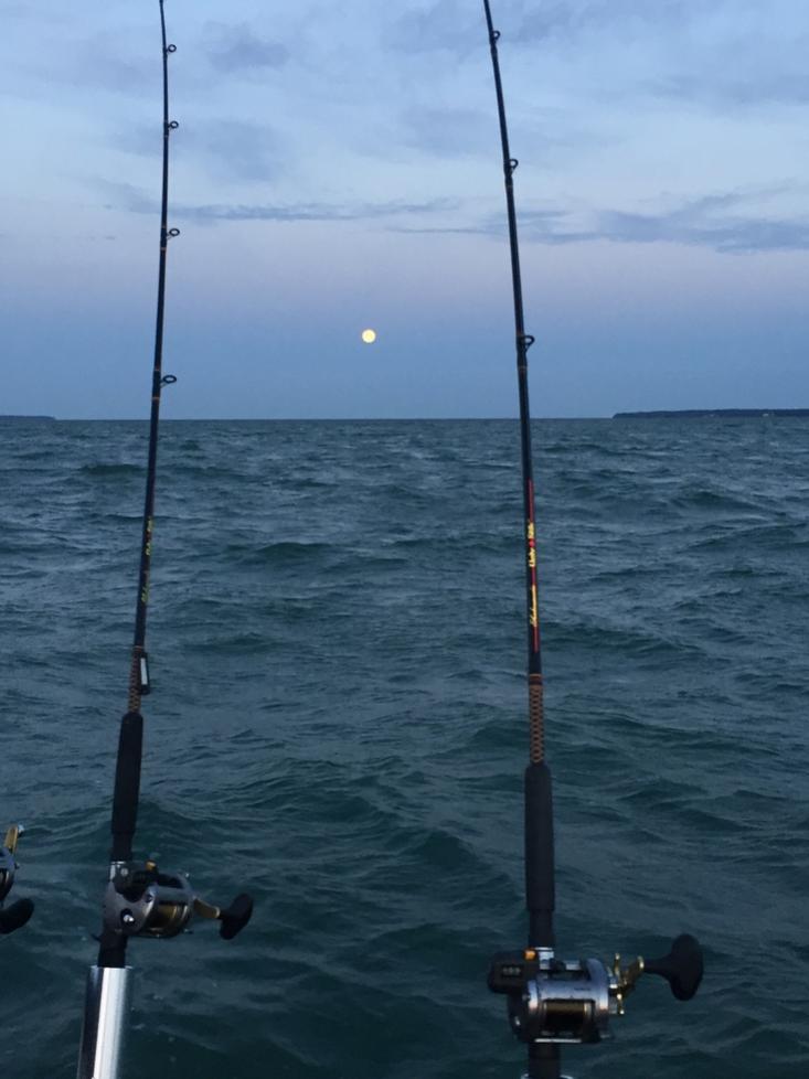 Around 6:30AM, the other charter boats started to arrive in droves, so we picked up lines and headed further north towards the Canadian line, where it was less congested. By mid morning my crew was running that fourth board on each side of the boat. At that time, we were running Bandits anywhere from 50 to 100 back at 2.1-2.3mph. We had a 2oz snap weight on each of the inside lines at 20/110 (20' back, put the snap weight on , and let it out another 90')... and, those caught fish also.